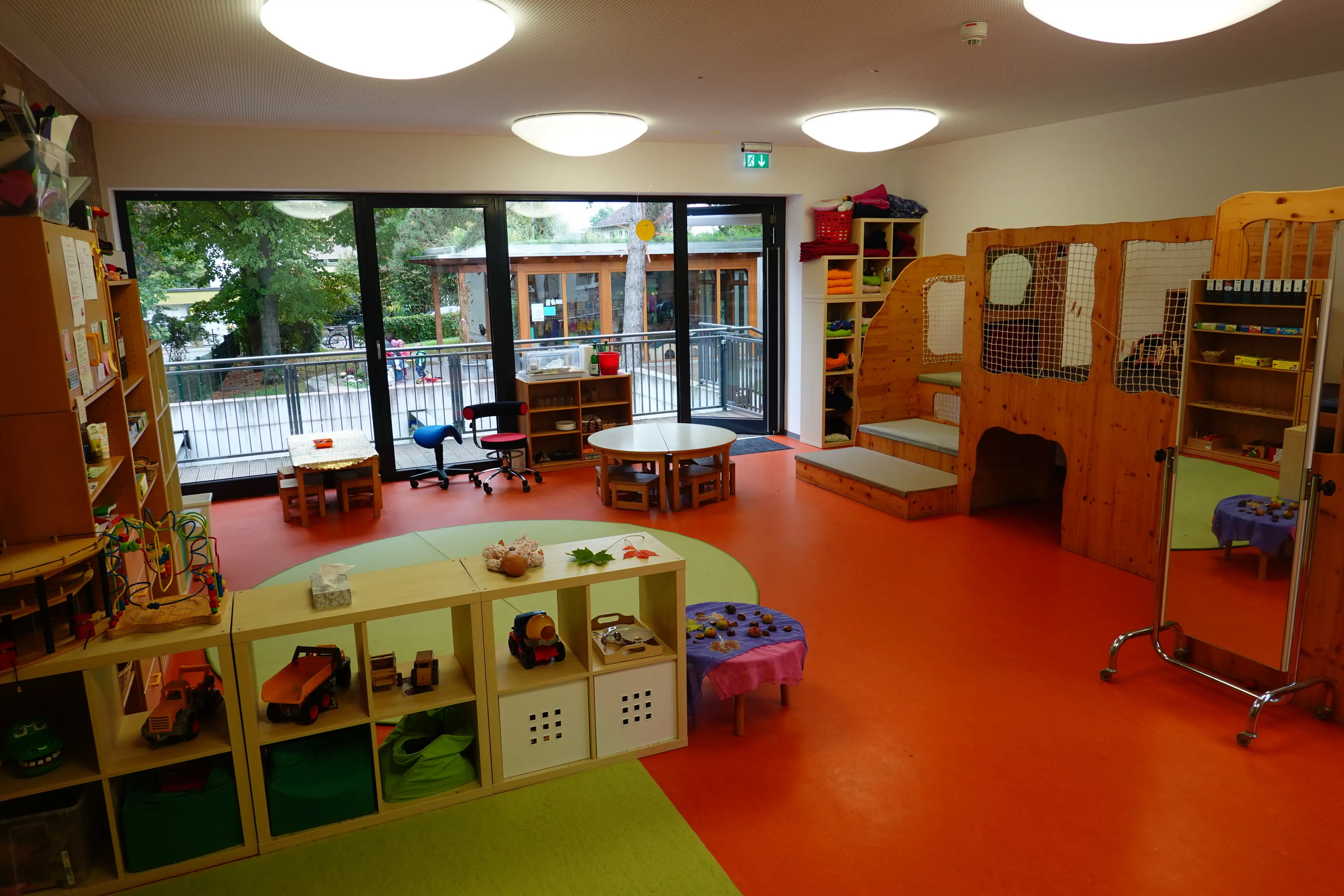 Unsere Räume sind nach Schwerpunkten ausgerichtet, um den Kindern vielseitige Möglichkeiten zur (Selbst-)Bildung anbieten zu können. In der "geöffneten" Zeit von 9.30-11.15 Uhr wählen die Kinder, ob sie im Mathe-/Bauraum, im Rollenspiel-/Theaterraum, im Atelier, dem Spiele-/Bücherraum oder im Außengelände (alternativ zum Bewegungsraum) tätig werden möchten. Der Essbereich im Untergeschoss wird in der Zeit von 8.00-10.30 Uhr zum freien Frühstück und ab 11.30 Uhr für das Mittagessen genutzt.